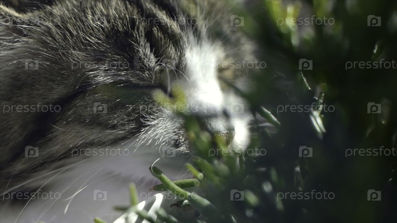 Кошка ест свежую зеленую траву. кошачая трава, домашняя травка. клип. естественная обработка волосатыми шариками, белый и красный кот питается свежей травой, зелёные овсянки, эмоционально, копирование пространства, концепция здоровья питомцев. красивая кр