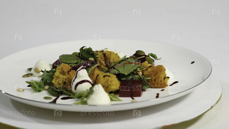 Салат с сельдью, свеклой, паприкой, красным луком, горчицей и бальзамическим уксусом. Салаты из салата, свеклы и филе лосося с деликатным сливочным соусом. Салат с зеленью, рыбой и свеклами 4K
