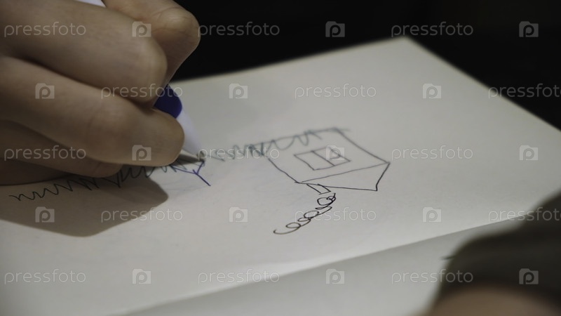 Ребенок рисует картину своей семьи и гуся в блокноте, ближайший снимок.Концепция.Маленький ребенок с помощью ручки нарисовал эскиз своих родителей возле дома