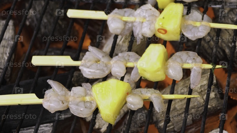 Сладкие и острые креветки. креветка на гриле с ананасом. вкусное блюдо на гриле