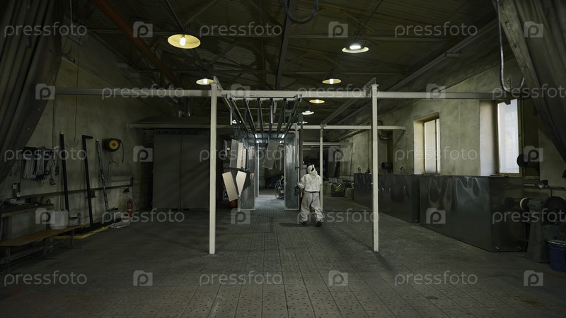 Работник толкает линию окрашенных металлических листов в камеру сушки.Креативное.Сталелитейный завод