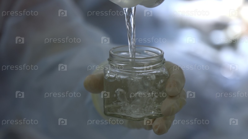 Заливка стерильной жидкости в небольшую емкость в операционной.Действие.Команда медицинских работников