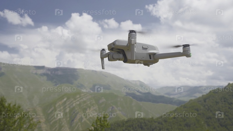 Квадрокоптер летает на фоне гор. Действие. Квадрокоптер летит и снимает красивые горные пейзажи. Квадрокоптер фотографирует зеленую горную долину