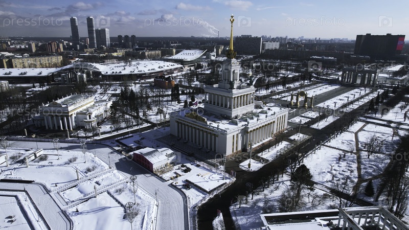 Вид сверху большой площади с исторической архитектурой зимой. Креативность. Историческая площадь с переулками и советской архитектурой в центре города. Зимний пейзаж с советской архитектурой на фоне горизонта с городом
