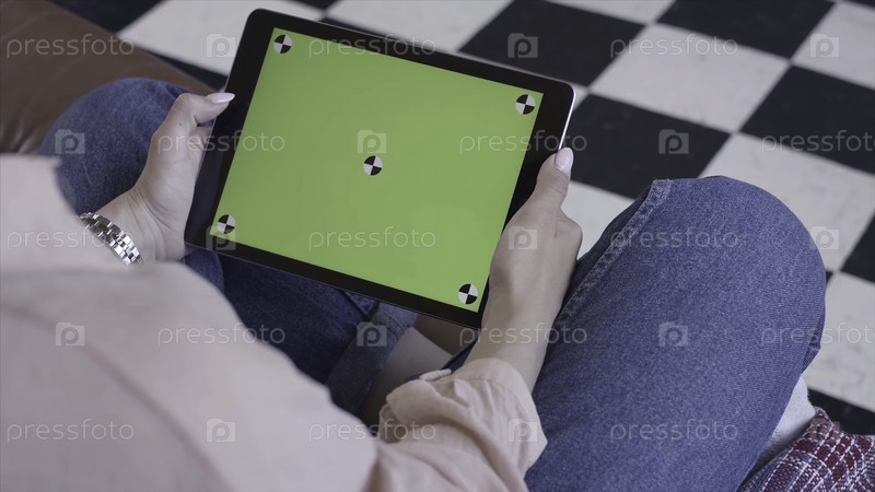 Близкий взгляд на молодую женщину, сидящую в кресле и смотрящую на планшет с зеленым экраном Chrome Key. Стоковые кадры. Chroma-экран для размещения собственного контента