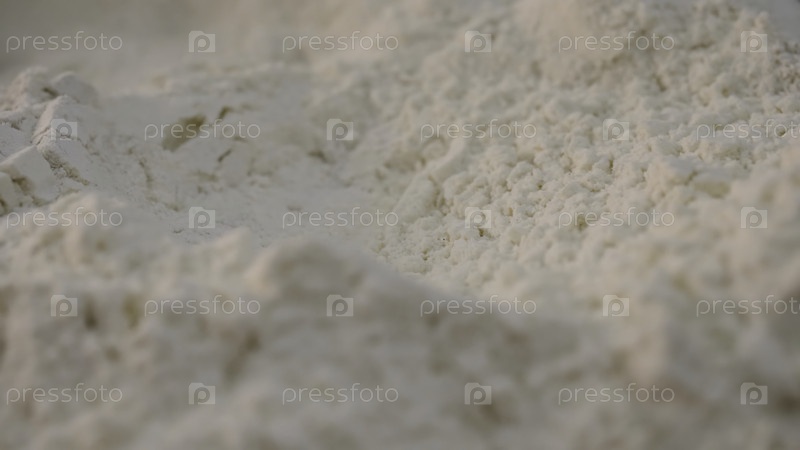 Ближайшее изображение хрупкой белой муки. Скриншоты на складе. Белая чистая мука фильтруется перед использованием в приготовлении хлеба. Белый плотный, но хрупкий порошок или мука