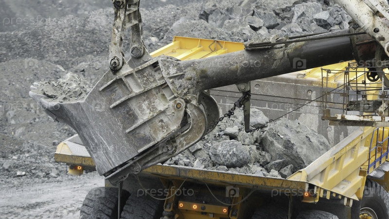 Близкий снимок экскаватора, загружающего дампер рудой в карьере