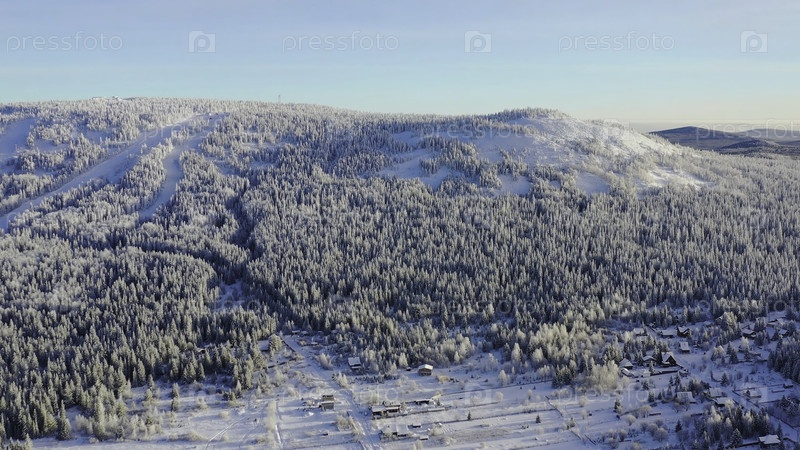 Вид с вершины горнолыжного курорта у подножия горы. Кадр. Уединенный горнолыжный курорт у подножия холма со лыжными трассами популярен в зимний сезон. Ясный солнечный день на лыжных склонах зимнего курорта