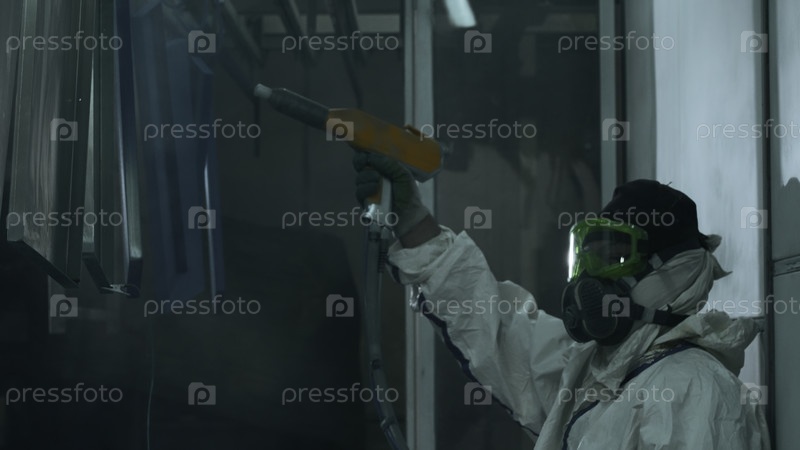 Процесс порошкового покрытия металлических деталей на сталелитейном заводе.Креативность.Работник в защитном костюме с пистолетом краски
