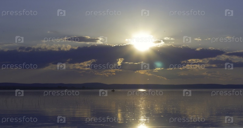 Закат над озером. Облака. Вода. Сан в небе
