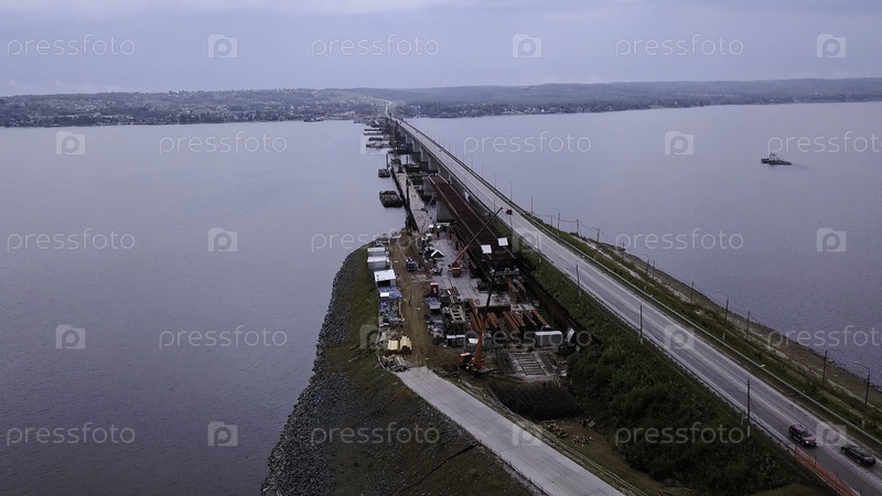 Вид с воздуха на широкую реку или озеро, пересеченные длинным узким мостом с движущимися автомобилями