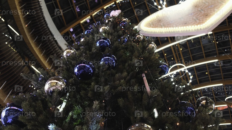 Вид снизу на высокую рождественскую елку, украшенную синими и серебряными шарами и гирляндами красочных огней, стоящих в каком-то здании