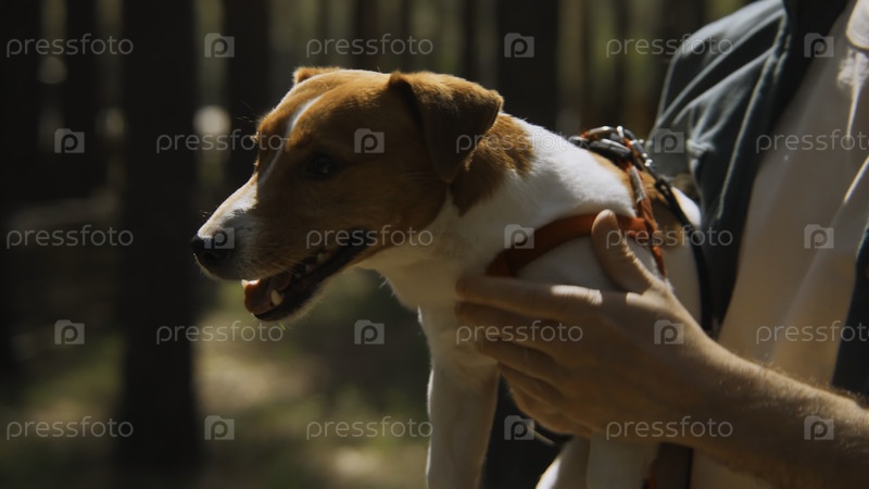 Мужчина держит красивую собаку в объятиях. Скриншоты. Красивый терьер Джека Рассела на руках в парке. Человек держит собаку с травой в зубах на руках в парке летом