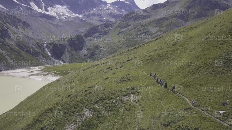 Панорамный вид на каменисто-желтый, зеленый холм в солнечный летний день и людей, которые ходят по тропе