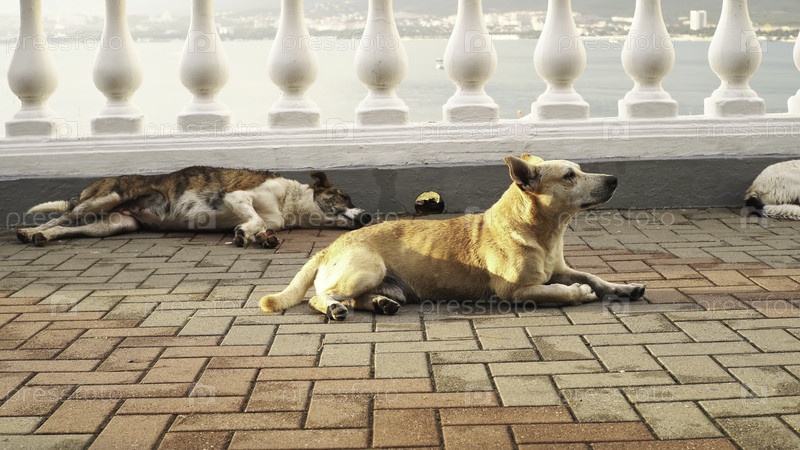 Бездомные собаки спят и отдыхают на открытом воздухе, бедная коричневая собака страдает от блох, лежащая на асфальтированном тротуаре под ярким летним солнцем
