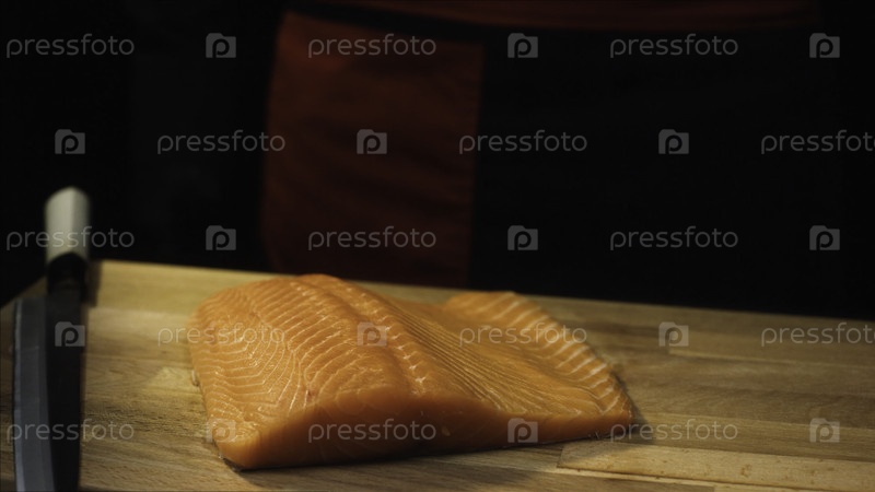Профессиональный повар в черном фартуке и перчатках кладет кусок лосося на деревянную доску, прежде чем нарезать его для посуды