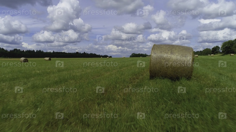 Вид с воздуха на зеленое поле соломенными роликами на фоне синего облачного неба.Снимок.Природный пейзаж свежей зеленой луга и стоков сена, окруженных зелеными деревьями