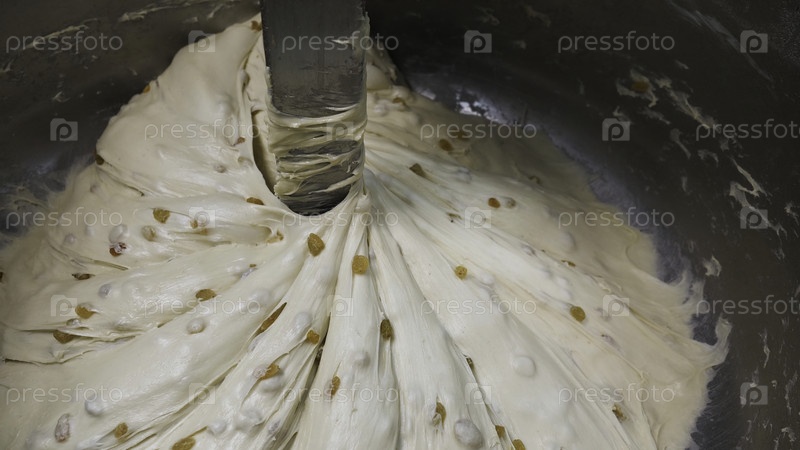 Ближе к процессу смешивания кондитерских изделий с изюмом в металлической таре, концепция питательных продуктов. Скриншоты. Процесс смешивания сырого теста на заводе