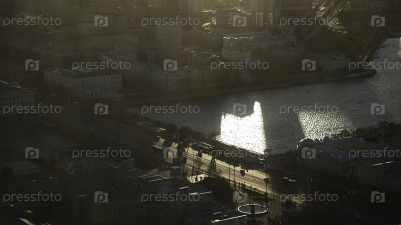 Вид с воздуха на крупный российский город, здания, деревья возле реки летом солнечным утром