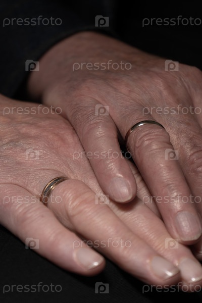 Руки зрелой, недавно замужней пары показывают свои кольца