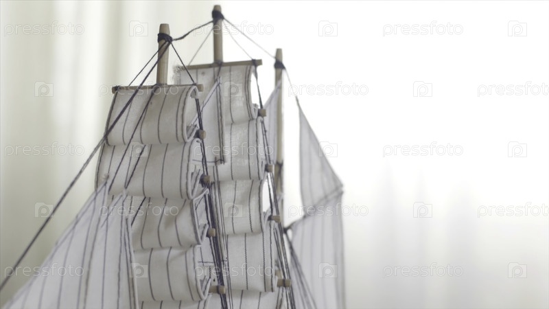 Деревянная модель игрушечного корабля, стоящая на деревянном столе в светлой комнате, концепция хобби