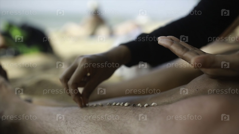 Ноги мужчины на пляже в песок в летний день каждый кладет зерно песка на ногу других геев, которые отдыхают