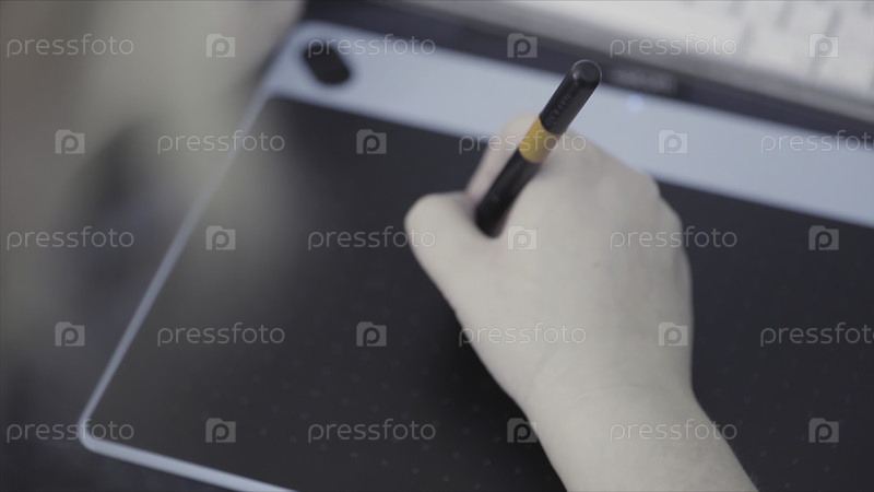 Ближайшее изображение руки дизайнера, работающего с цифровым планшетом. Технология, концепция дизайна и творчества, графический дизайнер, работающий с электронным устройством