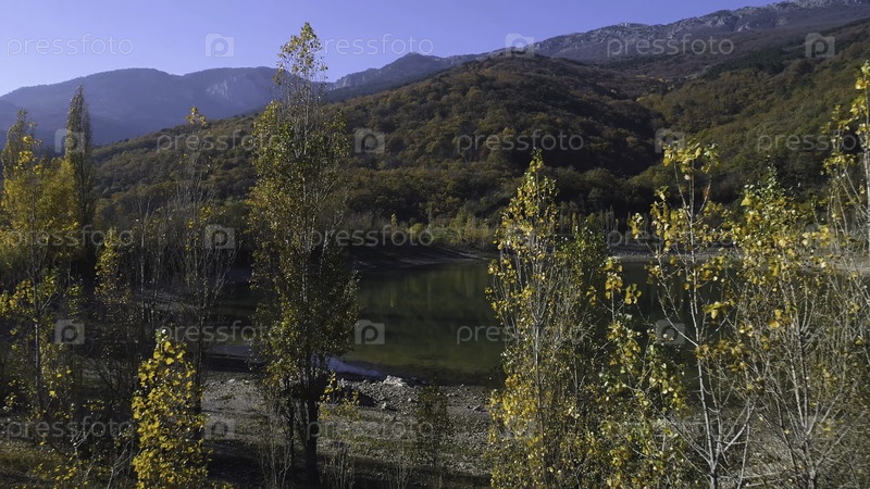 Вид сверху небольшого озера с отражением гор осенью. Снимок. Прекрасный вид со отражением красочных гор в озере осенним солнечным днем. Красота природы осени