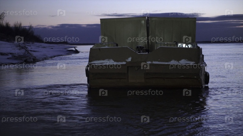 Баржа с контейнерами на реке зимой.Клип.Баржа перевозит груз с контейнерами вдоль реки зимой.Зимняя речная перевозка баржей