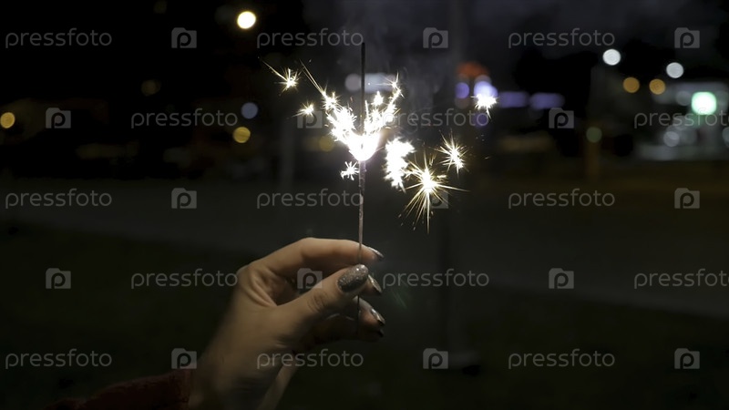 Близкий план женщины, держащей искру на улице.близкий план девушки с искрами. женская рука, держащая искры на улице. концепция праздника