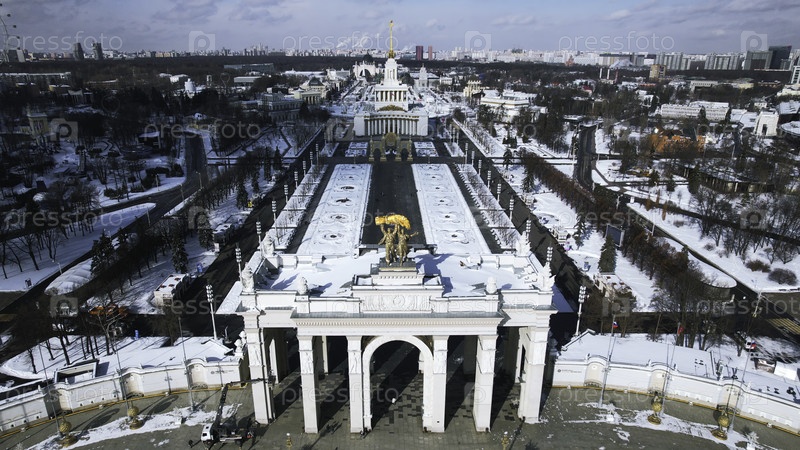 Вид сверху исторической площади с арками зимой. творческий. красивый исторический центр со сквером и парными арками зимой. советская архитектура в центре большого города с площадью в зимний день