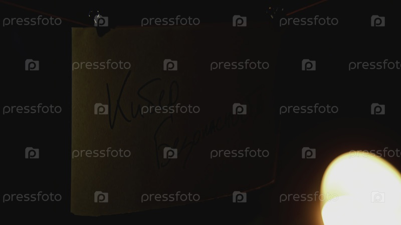 Мистические заметки на веревках. Стоковые кадры. Ночные записки на веревках с ребусом в кабинете. Таинственные слова на примечаниях в ночном офисе