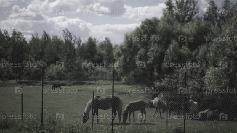 Крупный рогатый скот в загоне. Лошади, питающиеся травой внутри загона. Пастбище лошадей - это пастбище