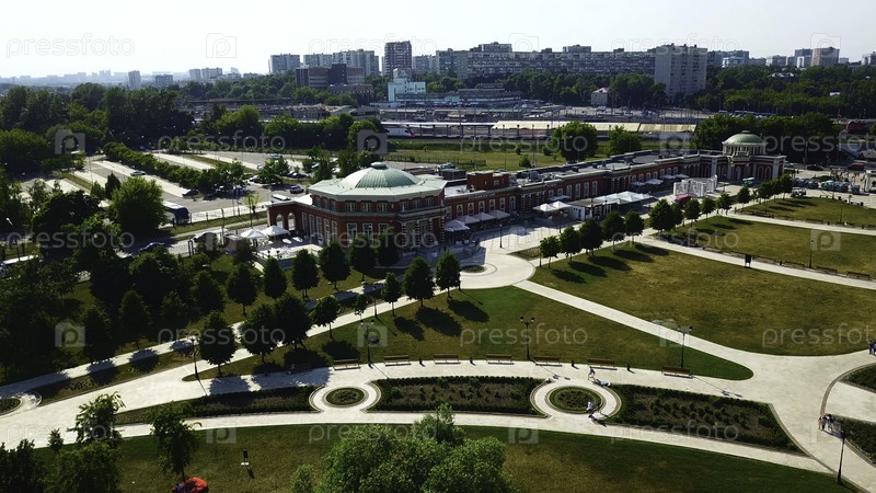 Вид сверху исторического здания с узорами садов в солнечный день. Креативное ландшафтное оформление сада с узорами возле исторического здания Исторический комплекс с садом на фоне современного города