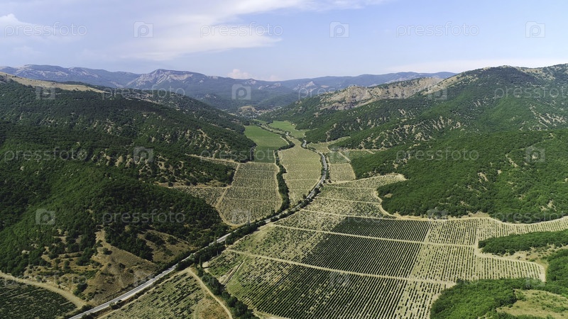 Вид с воздуха на сельскохозяйственные поля, окруженные высокими горами, покрытыми зелеными деревьями и кустарниками в летний солнечный день против синего неба