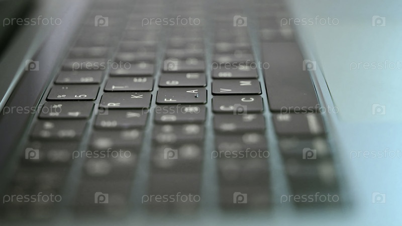 Боковой вид ноутбука или компьютера детали, черная клавиатура с белыми символами. действие. экстремальный ближайший план подсвеченной клавиатуры с плавным фокусом камеры