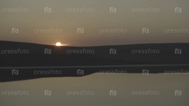 Вид с воздуха восходящего солнца на горизонте над холмом над спокойным океаном или морем