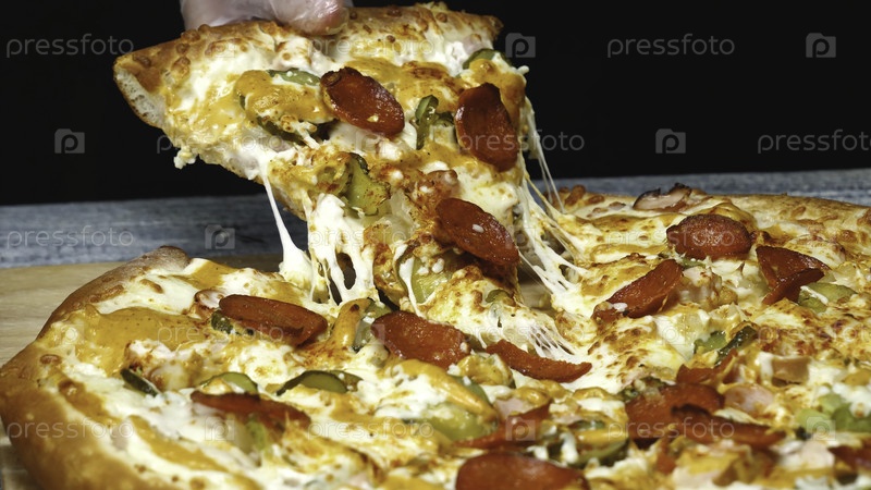 Человек берет вкусный кусочек пиццы с сыром. Рамка. Мужчина берет кусок итальянской пиццы и вытаскивает аппетитный расплавленный сыр