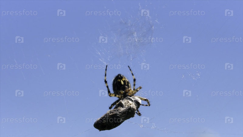 Сюжет охотничьего паука, пытающегося поймать маленькое насекомое в своей сети.Креативность.Детали дикой природы, паук на фоне голубого неба
