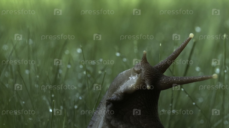 Макровизуальная картина мокрой улитки, ползающей по траве с капельками дождя.Креативность.Утренняя роса на стеблях и листьях дикого луга свежая зеленая трава, улитка в дикой природе