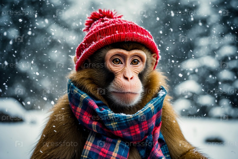 Портрет обезьяны в вязанной зимней одежде шляпы и шарфа, животное в снежных дождях зимой AI Generative