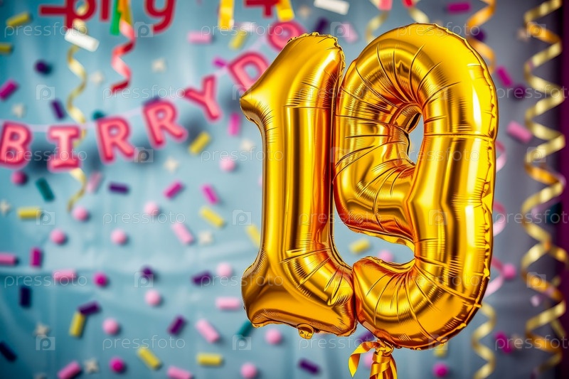 Гелиевый баллон на день рождения в форме числа девятнадцать, фигура золотой буквы 19 на фоне праздничного торжества