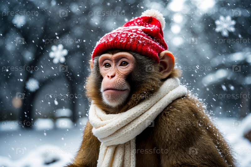 Портрет обезьяны в вязанной зимней одежде шляпы и шарфа, животное в снежных дождях зимой AI Generative