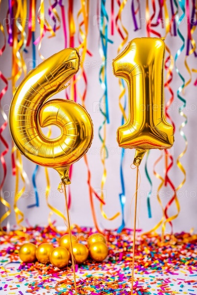 Гелийный баллон на день рождения номер шестьдесят один, фигура из золотых букв 61 праздник праздничный фон