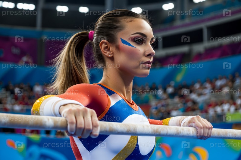 Соревнование по художественной гимнастике, женщина-спортсменка выступает