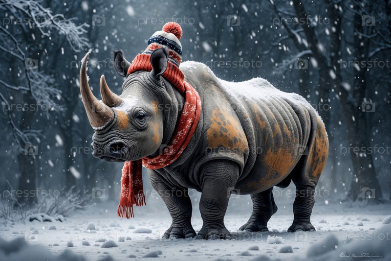 Генеративный портрет носорога в вязанной зимней одежде шляпе и шарфе, животное при снегопаде зимой AI
