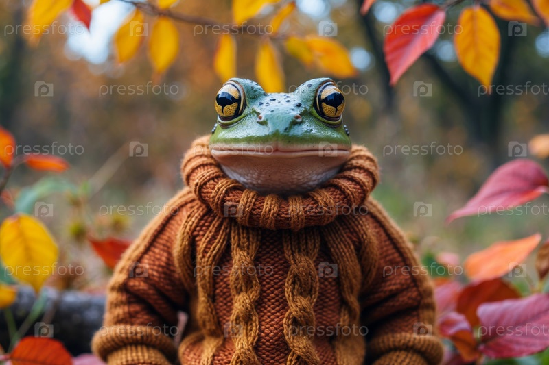 ИИ генеративная лягушка в трикотажном свитере на осеннем лесном фоне, животное в красно-желтом листе