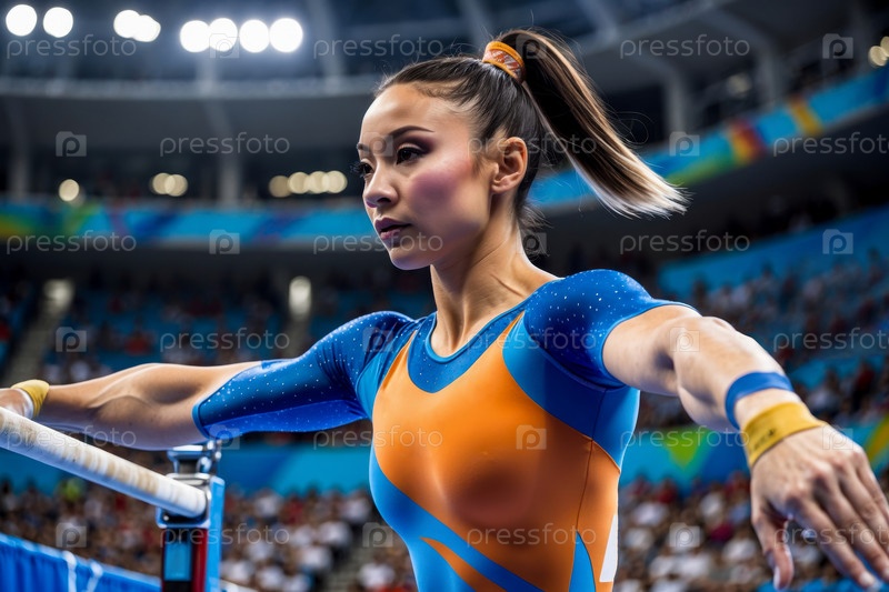 Соревнование по художественной гимнастике, женщина-спортсменка выступает