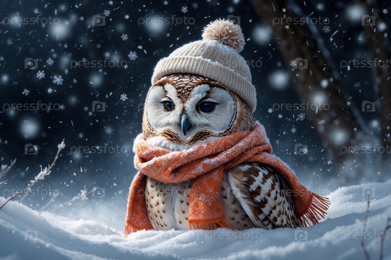 Портрет совы в вязанной зимней одежде, шляпе и шарфе, животное во снежных дождях зимой AI Generative