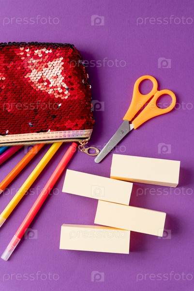 Натюрморт канцелярские принадлежности цветная пенка в карандашном чехле на фиолетовом фоне, креативное копирование пространства для текста, концепт гаджета бесплатный цифровой детокс